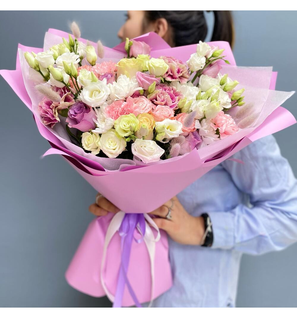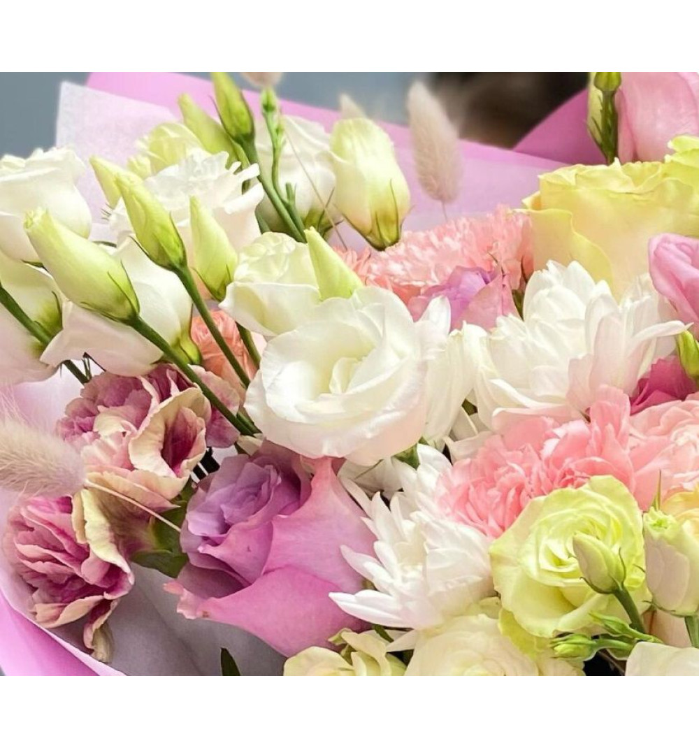 Этот удивительный авторский букет обладает неповторимой красотой и нежностью. В его состав входят кустовые хризантемы, прекрасные розы, ароматные гвоздики, эффектный лагурус и эустома белого цвета, которые придают ему особую изысканность и свежесть. Упаковка дизайнерская добавляет элегантности и подчеркивает уникальность этого букета. Он станет прекрасным подарком для особенного человека, наполнит пространство нежными ароматами природы и вызовет восхищение и радость.
